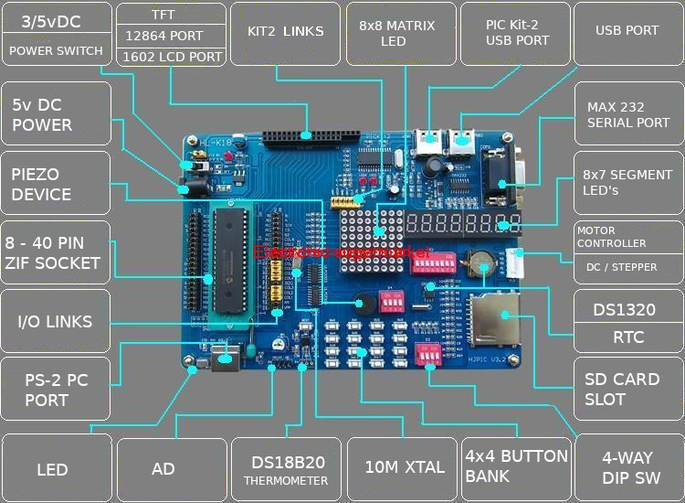 HL-K18 is a fully featured PIC development board, integrated USB-PICKit2 Programmer + Emulator Debugger , for direct application with PIC: 10F/12F/14F/16F/18F/16 bit . The HL-K18 Development board has a large number of integrated modules for PIC development integrating 30 modules.